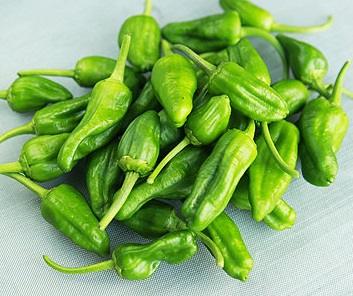 I first encountered the pimiento de padron (padron pepper) during my eight month stay in Spain in 2003 while visiting dear friends in Gallicia, the northwestermost province of Spain where the pepper originates. Here, the local Gallegos serve it typically as a simple tapa, fried in olive oil and sprinkled with coarse salt. While most of these delicious little green peppers are mild, about one in ten can be very, very, bring-tears-to-your-eyes spicy, hence the name "padron" which means "godfather" in Spanish, a reference to the one spicy one as "the godfather" of the batch. The spiciness of the pepper is influenced by different variables, including the amount of rain and sun it received while growing.